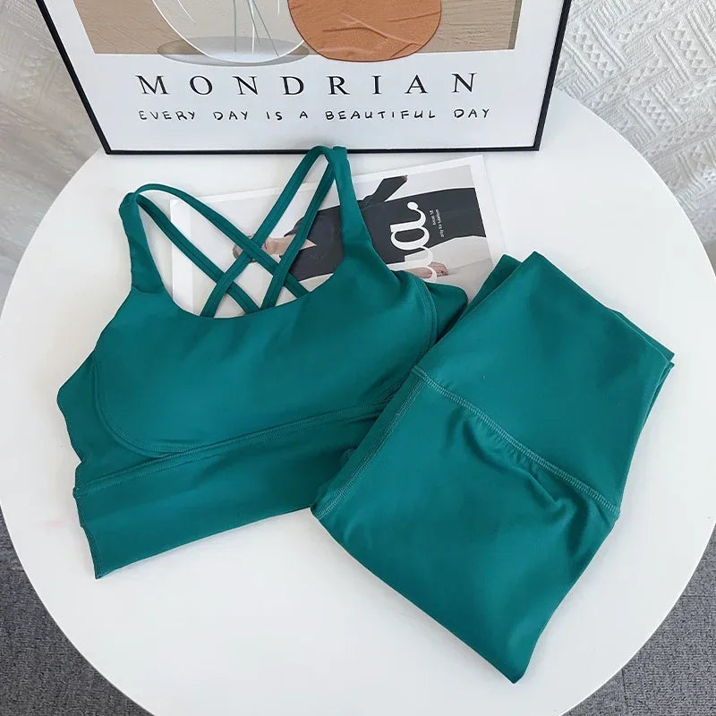 2024 New 2 Piece Yoga Set Breathable Fitness Suit Cross Back Yoga Tops Peach Butt Yoga Pants Pilates Running Fitness Suit
