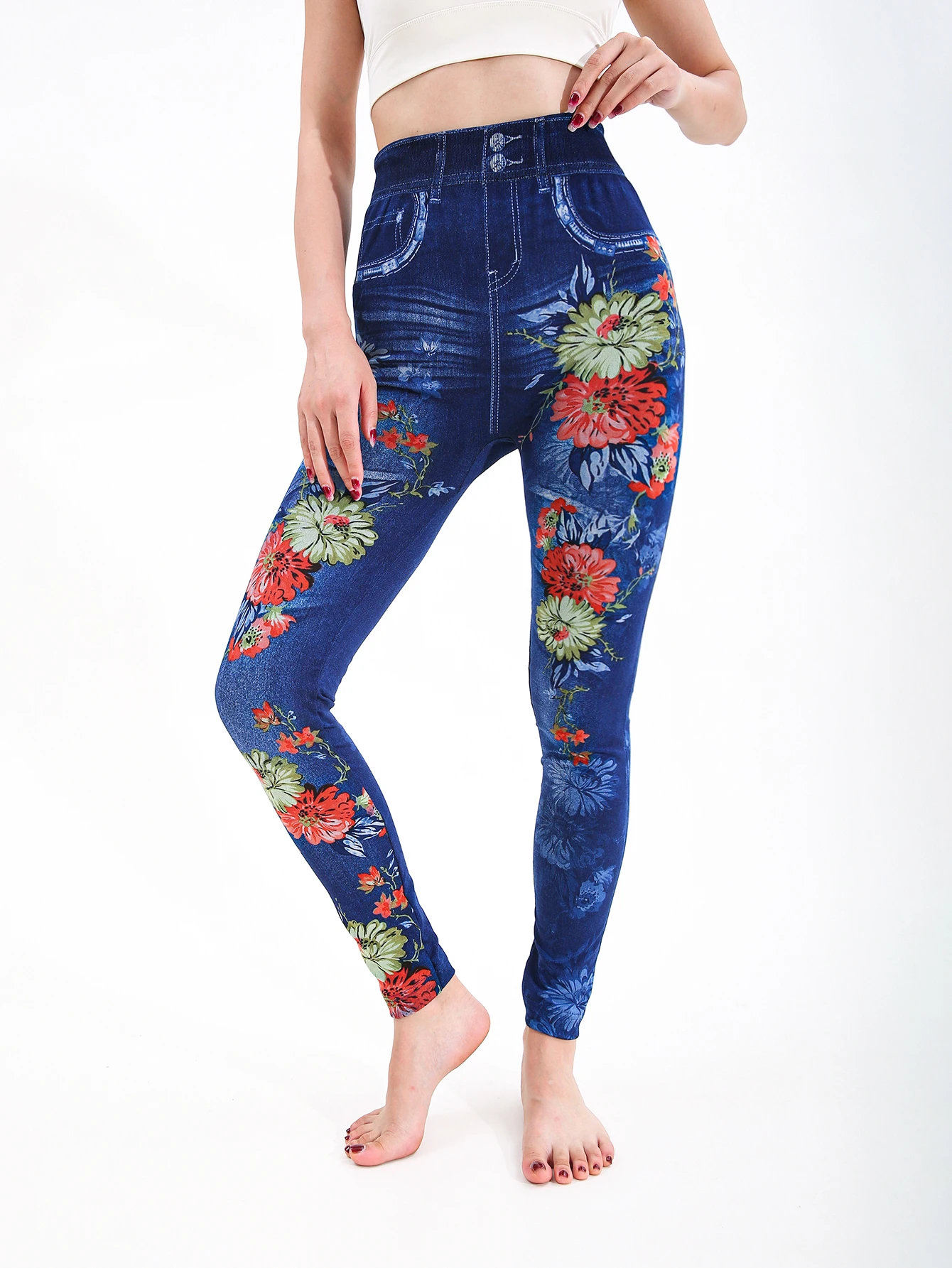 Autumn Winter 1PACK Women's Imitation Cowboy Chrysanthemum Pattern Sexy Tight Legging Casual Sports Elegant Fitness Yoga Pants