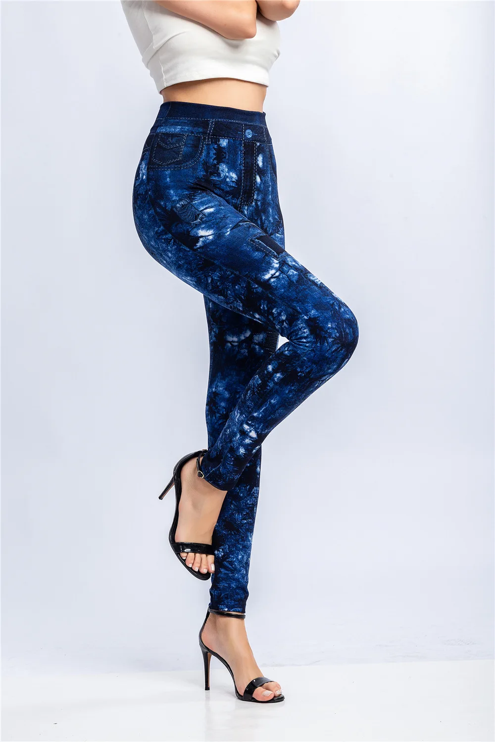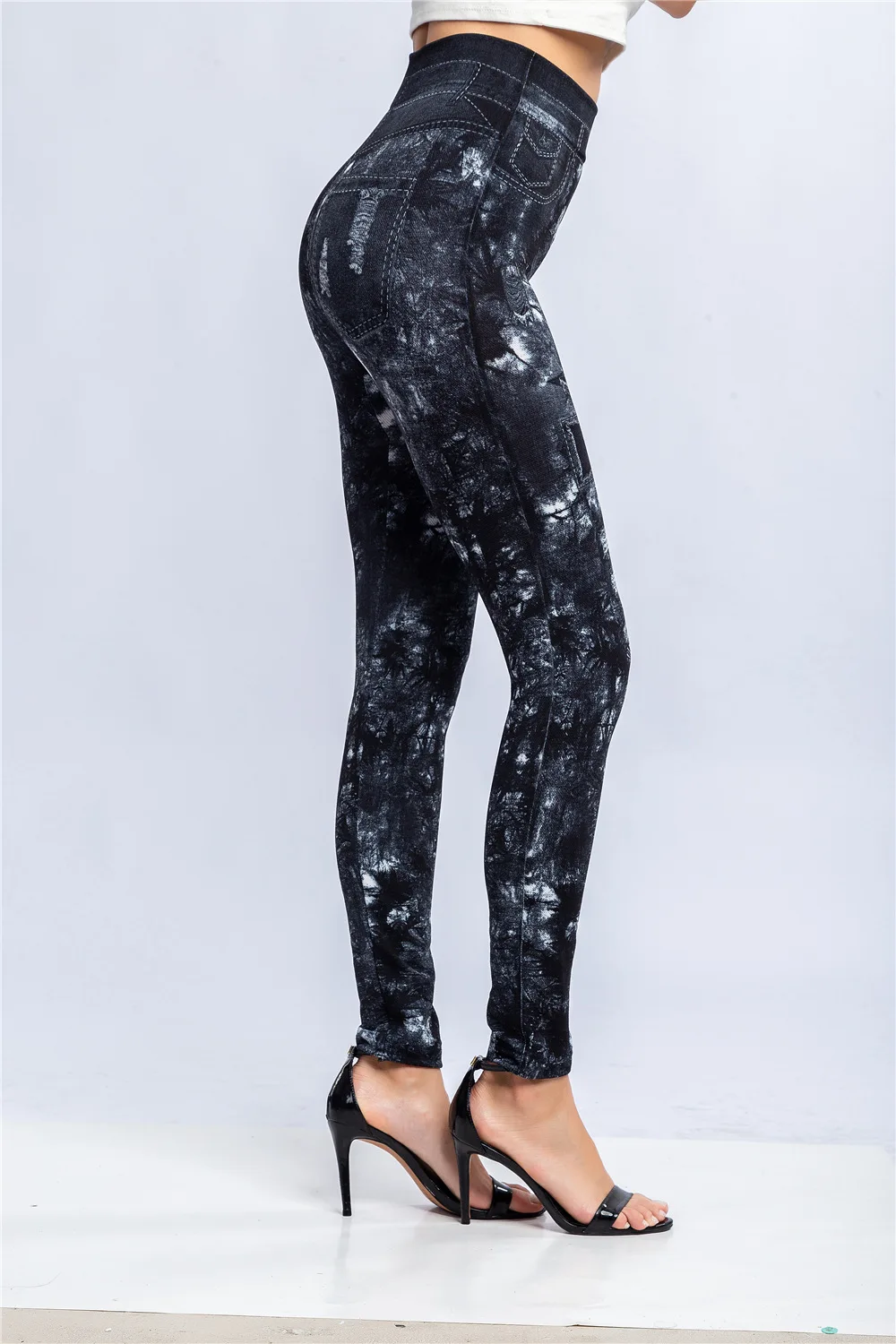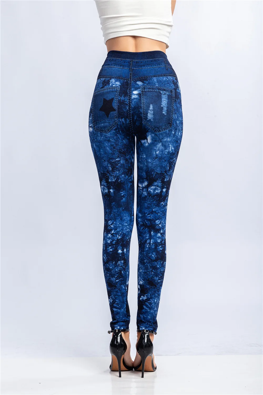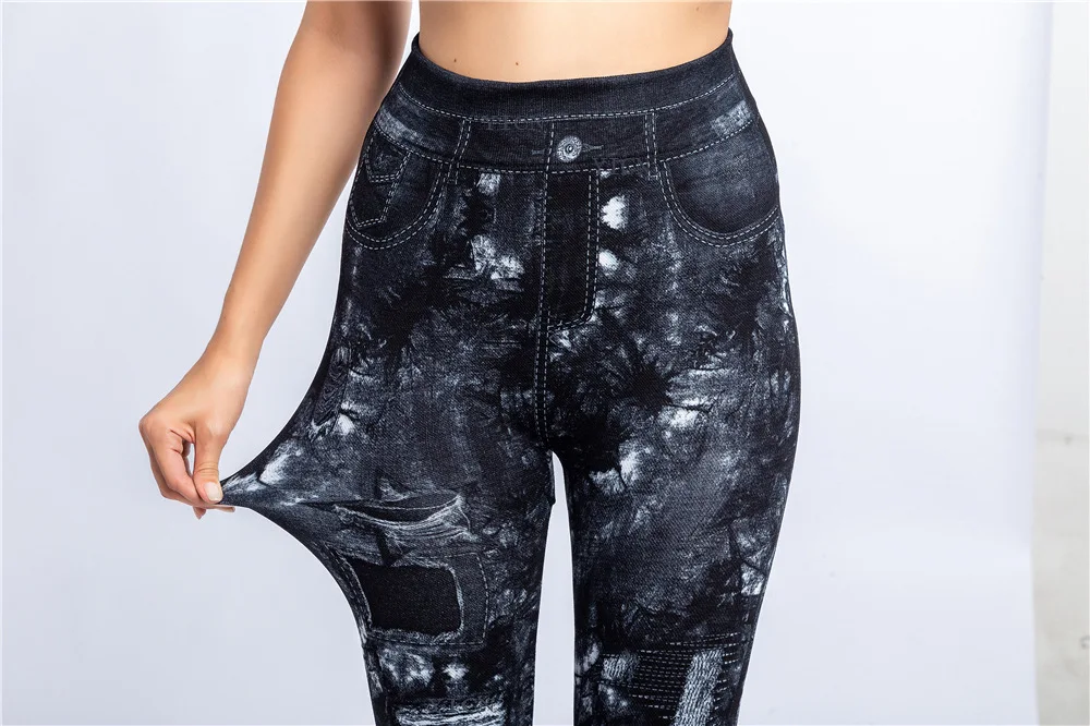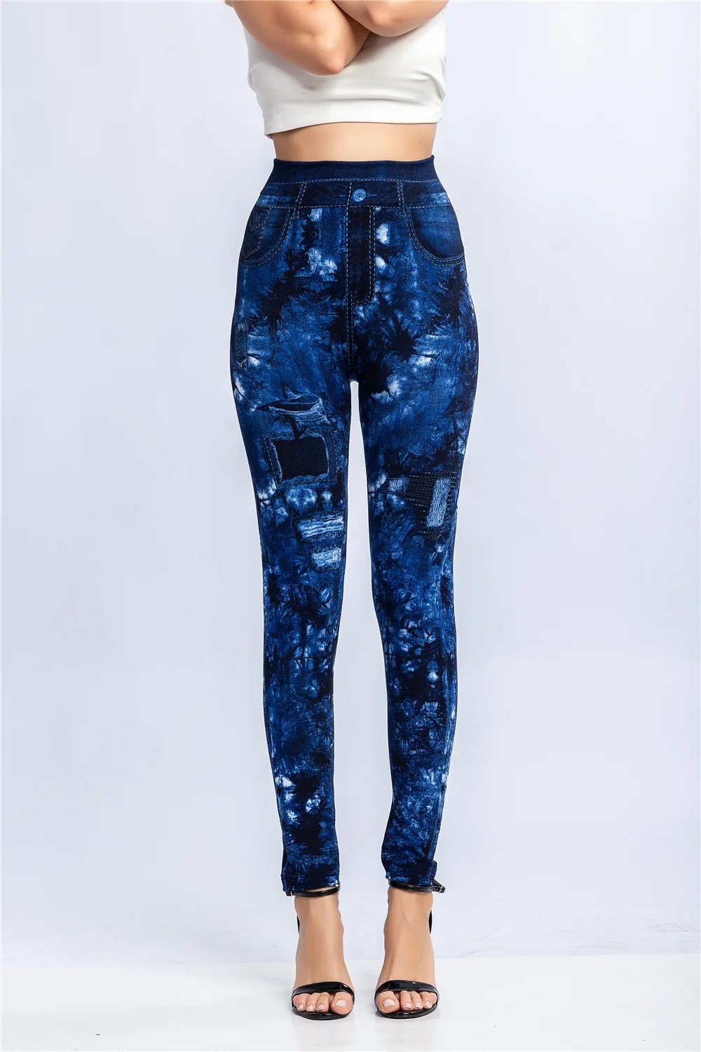 Women Print Imitation Denim Legggings Stretchy Slim Tights High Waist Hip Liftting Casul Pants Workout Running Gym Pants
