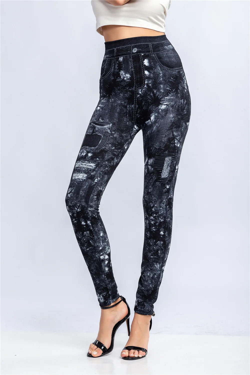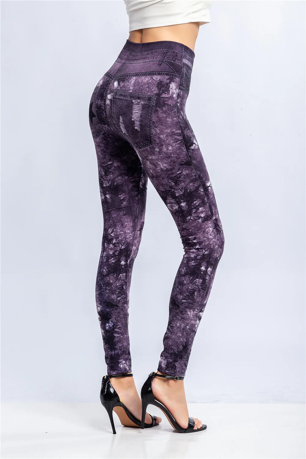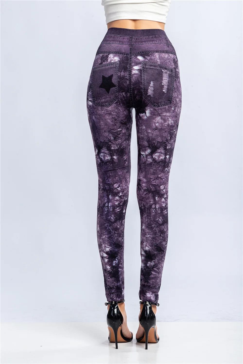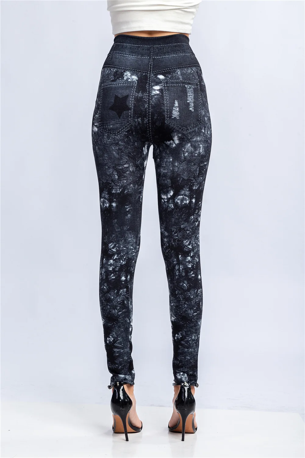 Women Print Imitation Denim Legggings Stretchy Slim Tights High Waist Hip Liftting Casul Pants Workout Running Gym Pants