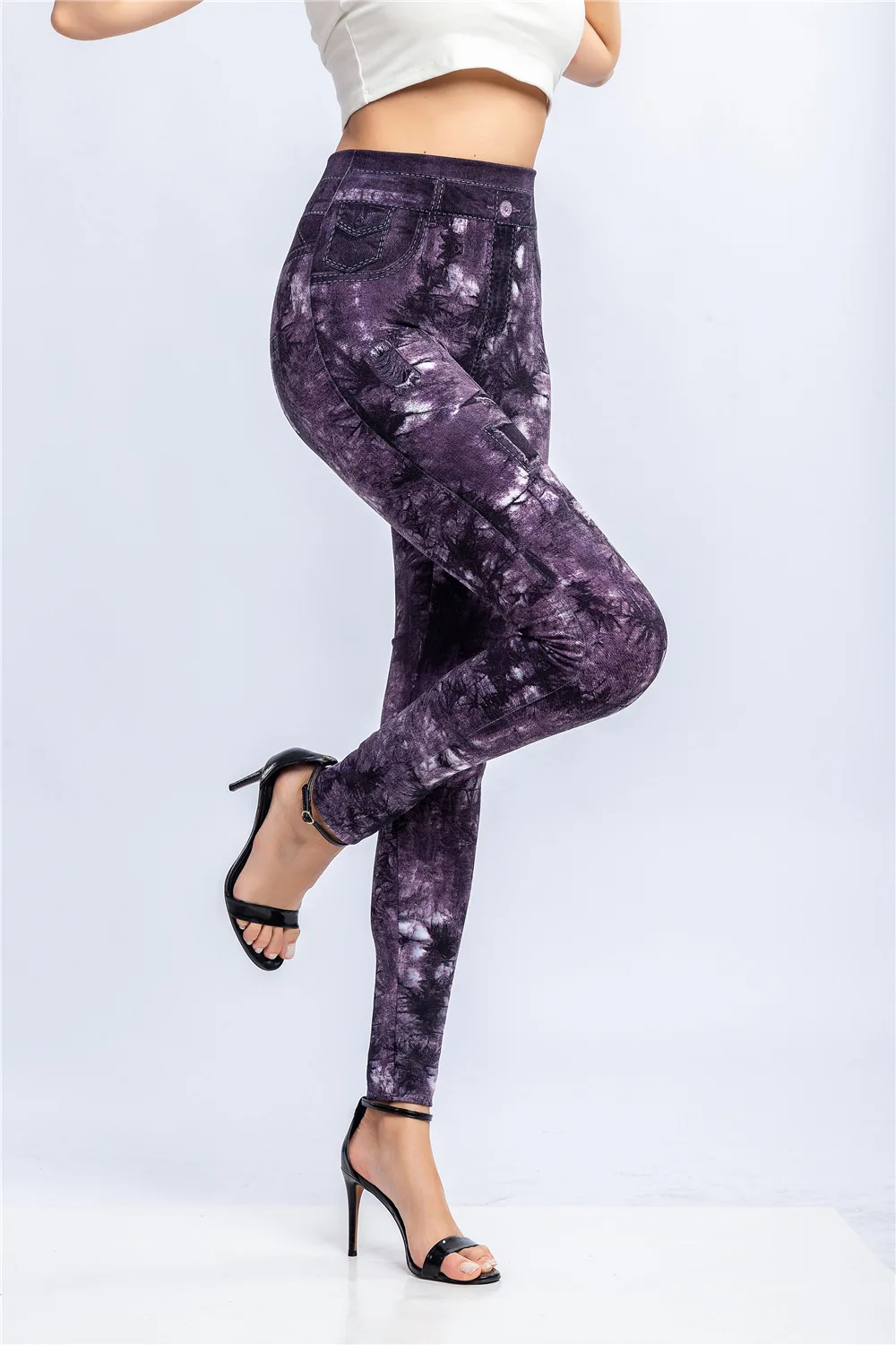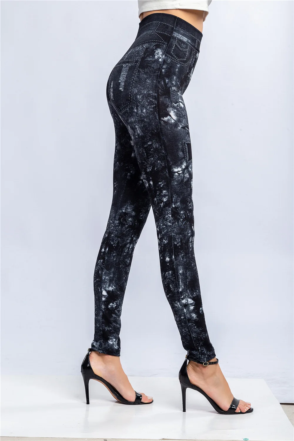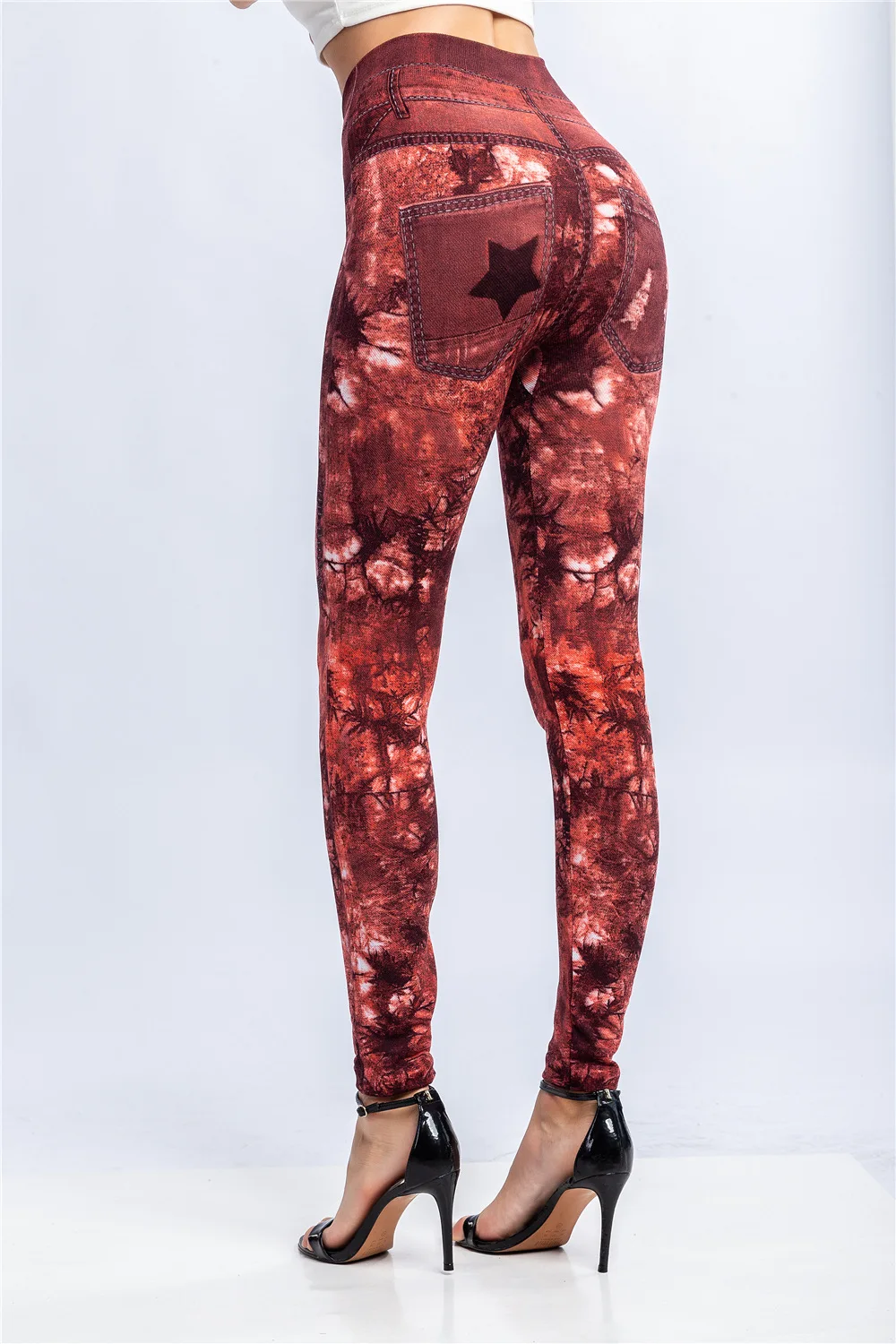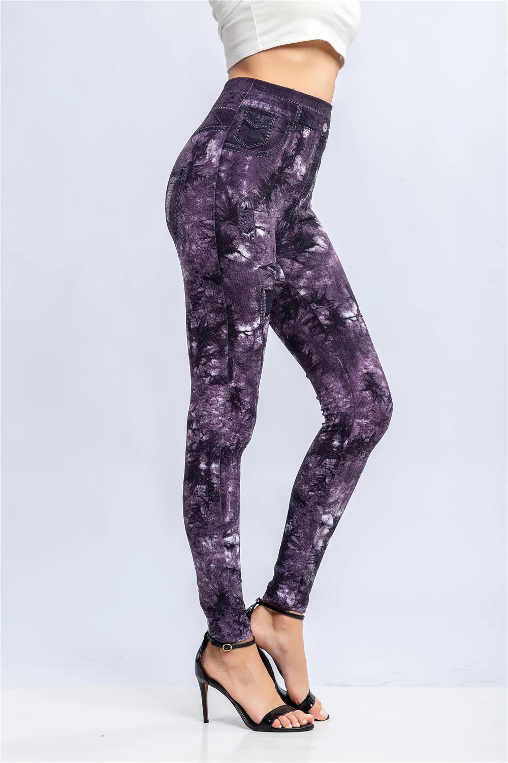 Women Print Imitation Denim Legggings Stretchy Slim Tights High Waist Hip Liftting Casul Pants Workout Running Gym Pants