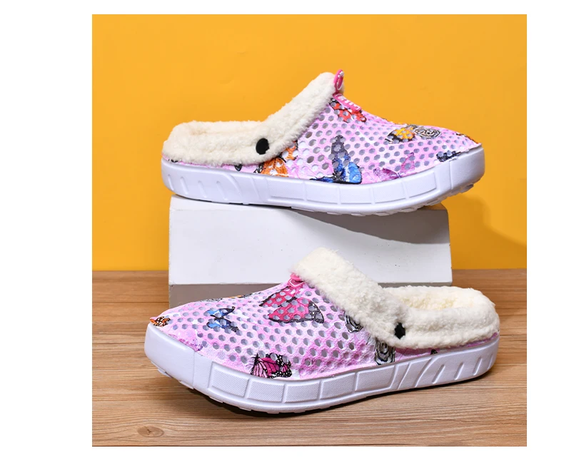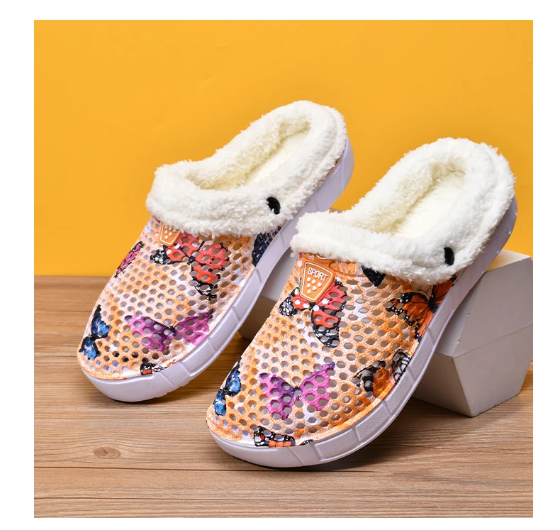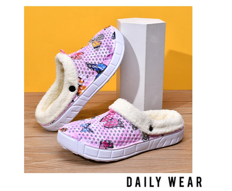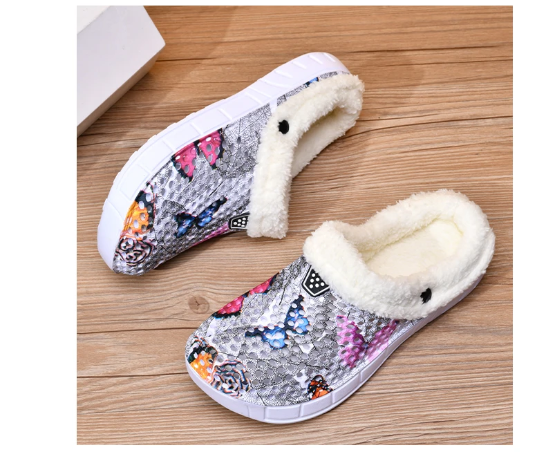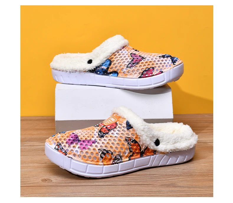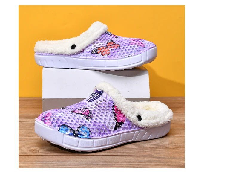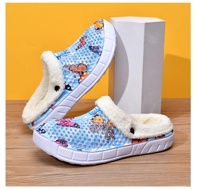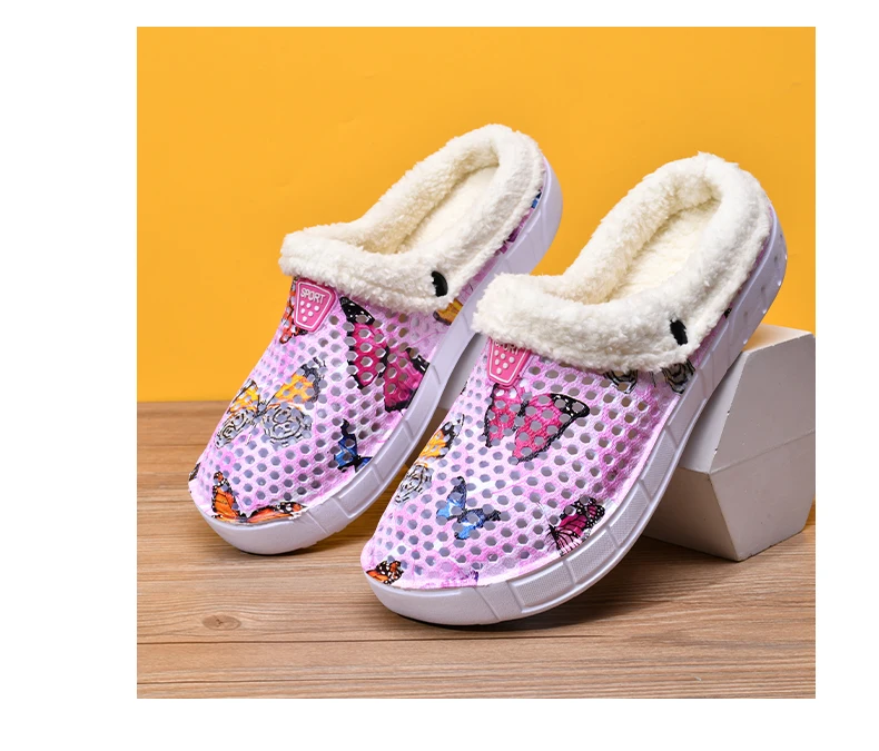 Women's Cotton Slippers Butterfly Pattern Clogs Mules Autumn and Winter Warm Plus Velvet Thickening