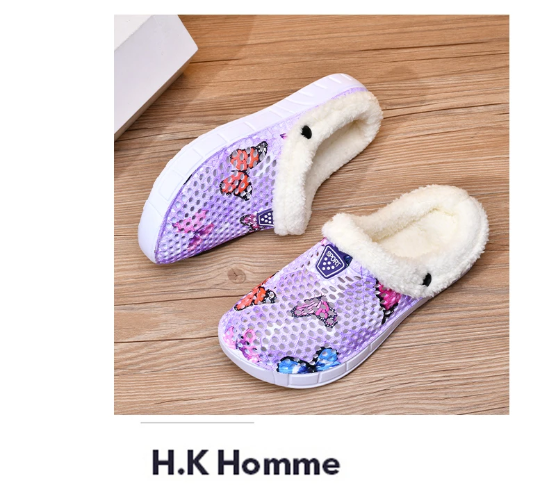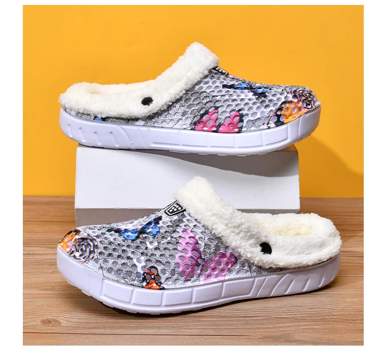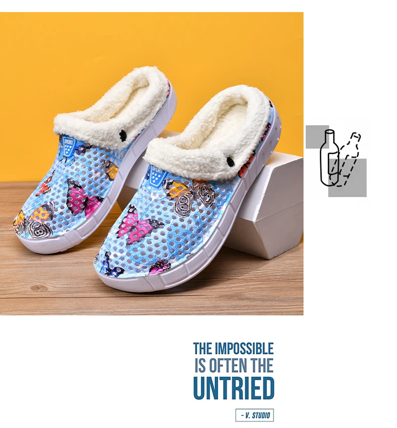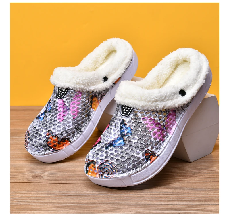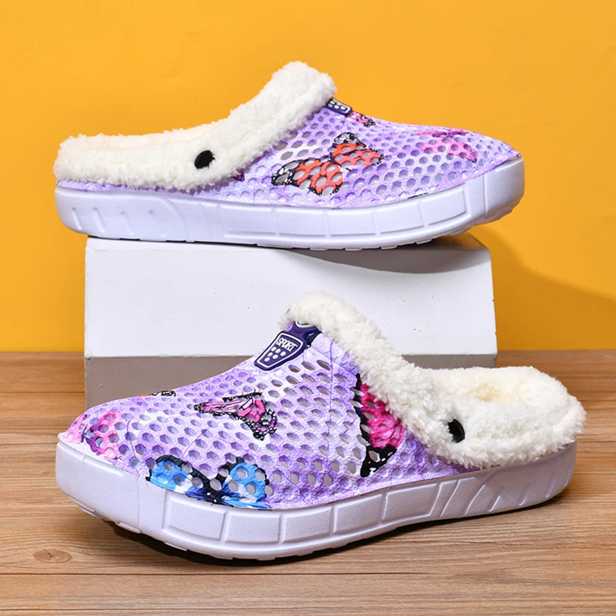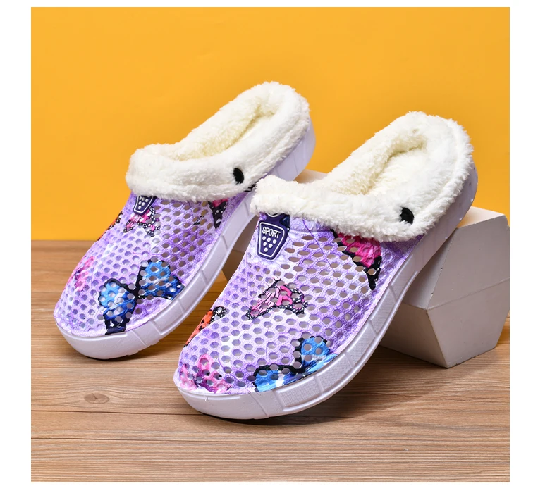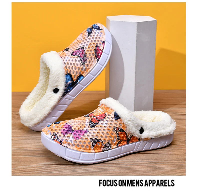 Women's Cotton Slippers Butterfly Pattern Clogs Mules Autumn and Winter Warm Plus Velvet Thickening