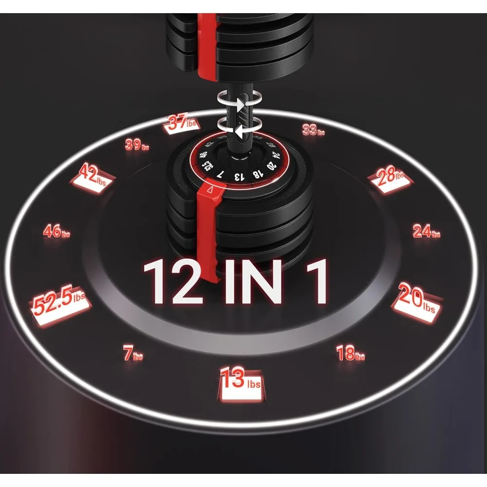 Here is a rewritten product description based on the provided information: --- This versatile 12-in-1 adjustable dumbbell set offers a broad weight range from 7 lbs to 52.5 lbs, allowing for incremental adjustments to accommodate various resistance levels and exercise intensities. The 1-second adjustment feature makes it easy to switch between settings with a simple grip, twist, and lift of the selectorized, anti-slip handle, aided by clear dials for easy readability. Durable and sturdy, these dumbbells are constructed with solid steel plates and are covered with polypropylene to provide extra protection against water damage and wear. They are designed to deliver total body results, enabling you to perform both heavy exercises like shrugs and lunges, as well as lighter exercises such as curls and raises, all within a wide weight range. Space-efficient and compact, this gym weight set measures only 16 inches in length, 8 inches in width, and 8.5 inches in height, making it easy to store under a workout bench or on a garage shelf after your workout sessions. --- This description maintains the original meaning while rephrasing the content and omitting special symbols.